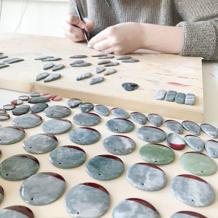 Katrs gabaliņš tiek atsevišķi noslīpēts, lai tas būtu pavisam gluds. Kad visi porcelāna rotas gabaliņi ir perfekti, tiem pēc nepieciešamības tiek izurbti caurumi, lai vēlāk pievienotu āķus.