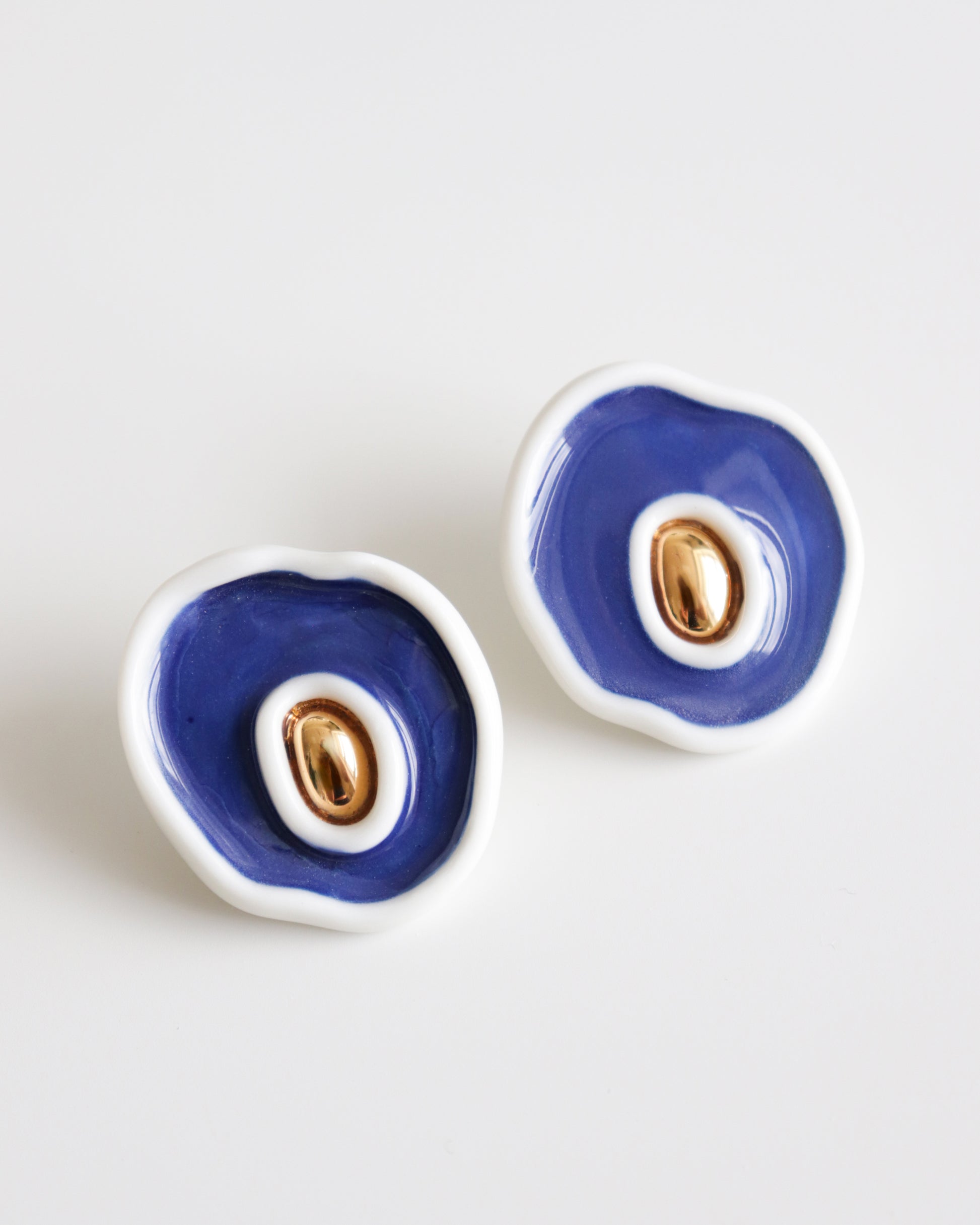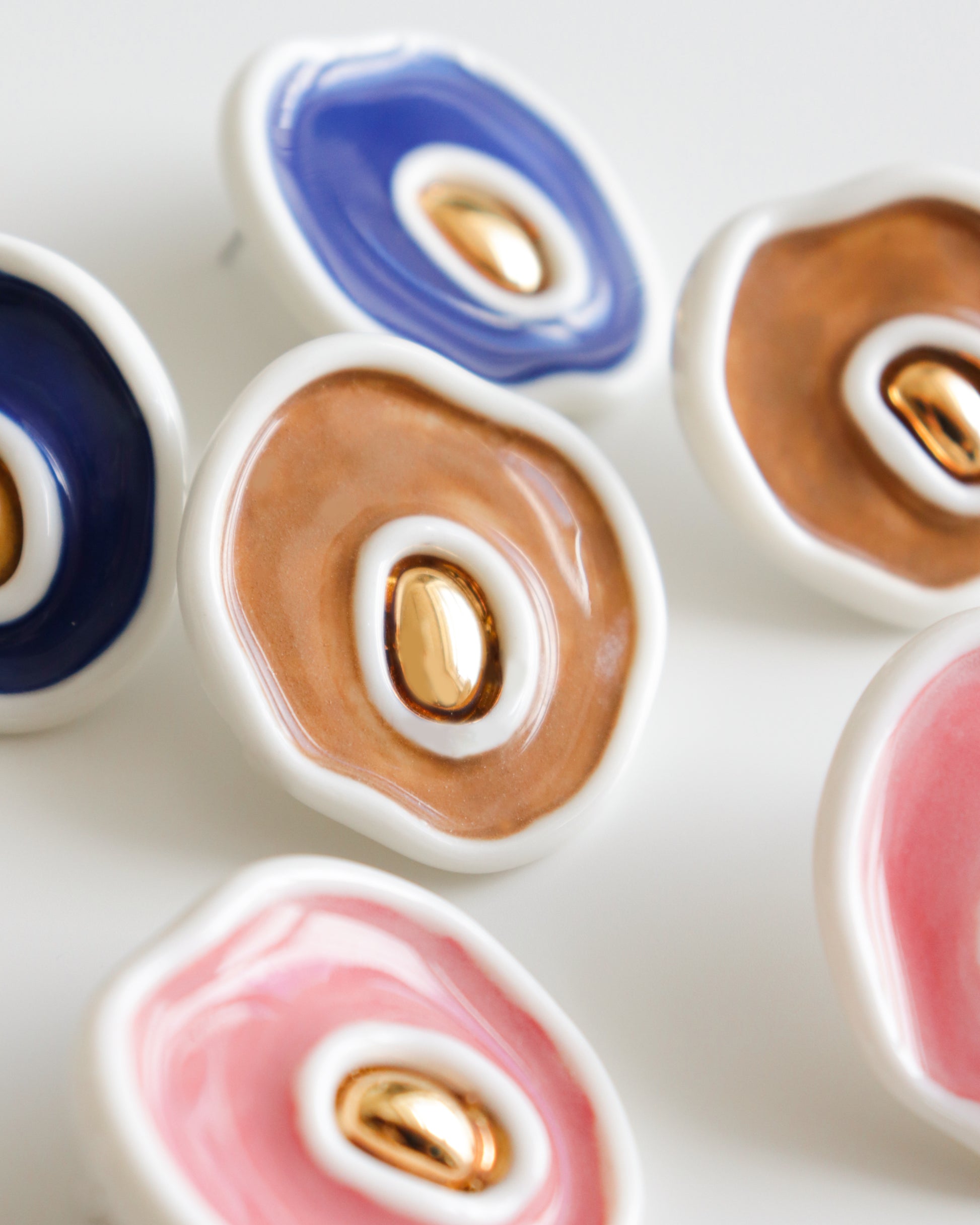 With these earrings, that same sense of abstraction and organic movement is reimagined in porcelain on a smaller scale and painted with 24k gold for a touch of luxury.
